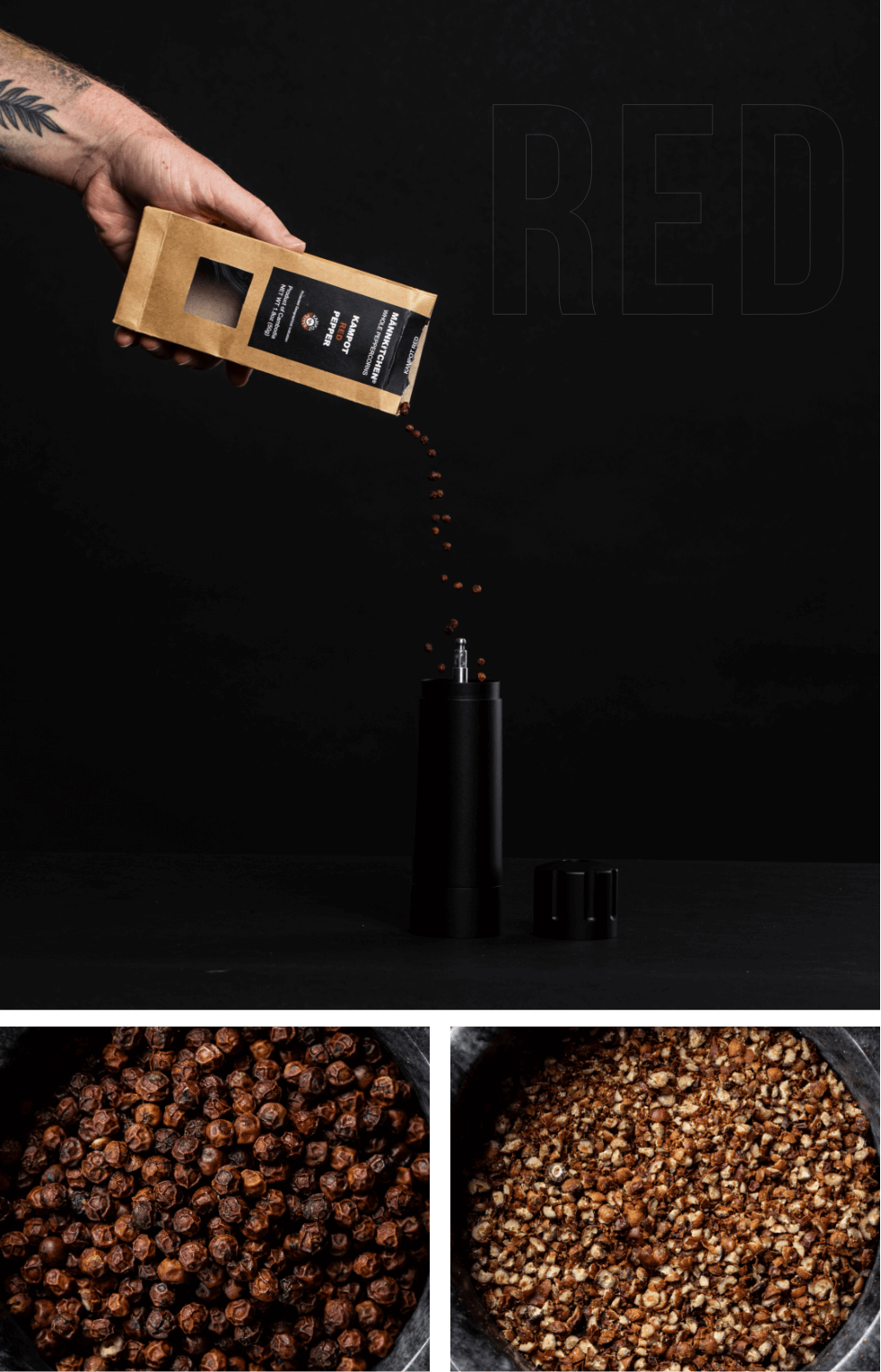 Our Black Pepper, Red Pepper, White Pepper, and Smoked Black pepper all come from the same flowering vine, Piper Nigrum. Each type of pepper is harvested at different points of ripeness and then carefully prepared to maximize its unique flavor, aroma, and heat.